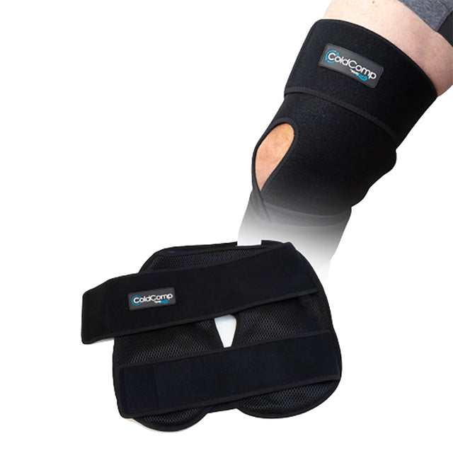 The ColdComp reusable ice compression knee wrap is a portable ice compression device that utilizes gel and compression to reduce inflammation and relieve pain.